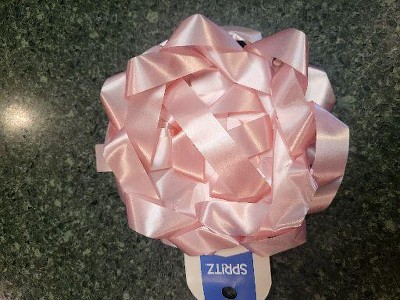 Add a flourish to your gifts by decorating them with this Large Shiny Gift Bow from Spritz™. This large decorative bow features light-pink ribbon strands in a shimmery finish arranged into a blooming flower-like shape to add the perfect finishing touch to your presents. Simply attach this decorative pink bow on your wrapped gift or gift bag for eye-catching flair, making it great for birthdays, anniversaries, baby showers or any other special day or occasion.