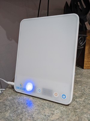 The Suncatcher lamp really lifted my spirits and helped give me the boost I needed with too much cloudy, sunless days! It is a nice size, large enough to be effective but doesn't take up too much desk space. The lamp has 3 different brightness settings and a variety of time settings! I don't think I can use the highest brightness as even the 5000 setting (shown in the picture) gives me a slight headache to start. It is really bright while I work, BUT each time I used it has gotten better! I started with the 15 min setting and 2x per day! I noticed it gave me an energy boost when I was feeling down or tired! I liked that it had a stand to hold itself up on my desk and also the option to hang it on the wall!