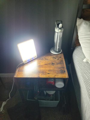 I've been wanting to try one of these products but I guess I wasn't prepared for just how extremely bright it is. The box shows a person working on the computer right next to it. Due to the extreme brightness that just isn't possible for me. It does have three brightness settings but even the lowest setting has me reaching for my sunglasses. I haven't noticed any effect on my mood yet so will need to continue using it for a longer amount of time to see if I notice a difference. It is better used during the day because at night it has the look of a flood light. The timer function on it is an asset and the cord plugs in securely and is a decent length. The fold in stand that holds it up is a bit flimsy though and alight movement can cause it to tip over.