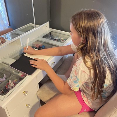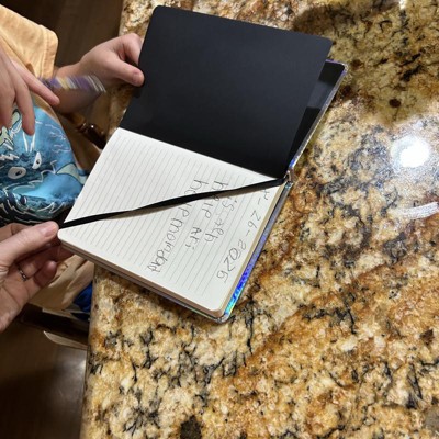 [This review was collected as part of a promotion.] My daughter loves writing in this small size notebook. This notebook is iridescent on the outside covers with the main color being silver. There is a built in bookmark that is connected to the notebook. There is also a strap that you can use for total closure of the notebook and to keep loose papers inside. This notebook is college rule spacing. The notebook measures about 6“ x 6“. I received an incentive to write this review.