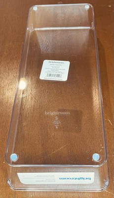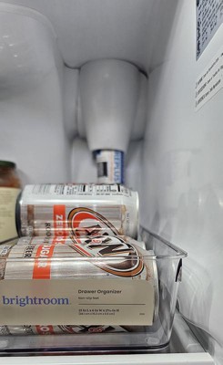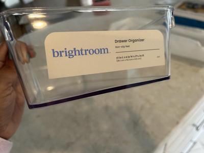Brightroom clear drawer organizer with non-slip feet. The dimensions are listed as 15” long x 6” wide x 2 9/16 “ high. It is 15” x 6” at the opening of the organizer. Because it is tapered, the inside measurements of the bottom are approximately 14” x 5”. This multi-purpose organizer fit in my desk, bathroom vanity and kitchen drawers as well as in my refrigerator. It’s perfect for the workshop too! It is great for desk items, kitchen towels, hand towels 12 oz soda cans, cosmetics, spices and so much more! Manufacturer recommends hand wash only. Made in China. The only drawback was a misplaced anti-slip foot. It just looked odd. A great organizer for any room in the house!