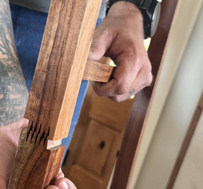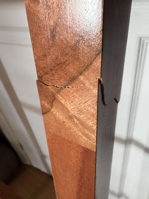 Q: I received mine today, and the top was broken. Tried putting it back, but noticed there’s no screw just chipped wood. Is it supposed be loosed like that to till forward or is it defected? Online pict don’t look tilled over.