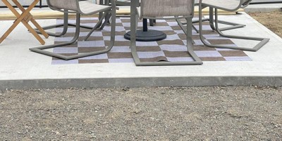 I ordered the black and taupe rug for our patio area and although we initially liked it- once it rains it has much more of a blue color rather than black. I don’t know if it’s due to the thin rubber layer beneath, but it definitely did not retain the original color. It’s also very thin.
