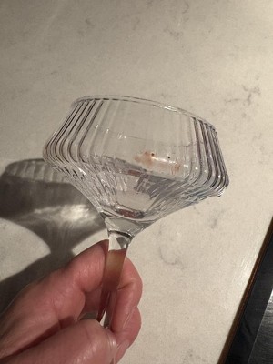 These were not packaged well, so I was worried when I opened the box (a mug I had ordered from Target in January packaged the same way did not make it in one piece), but both survived. These are lovely. I bought two just for me to have my sweet whites and rosés/ Plus we don't have any coupe glasses in our collection, so a fun, cheap option to start with. They are very small and don't hold much, but I was aware of the capacity from the description. The size is good for my hands, making them easier to manage than some larger ones I have used. Nice weight to them making them feel way more expensive than they are. One did arrive with a strage, dried strawberry jelly looking substance on it (see photo). Once washed with hot soapy water and some elbow grease it was fine. They are a little hard to wash with the ribbing and shape, but just so lovely. I used one immediately (once dry from washing) and it made my drink feel more sophisticated than using our regular white wine glasses and will probably help with portion control too. 😂