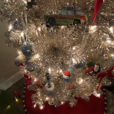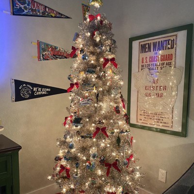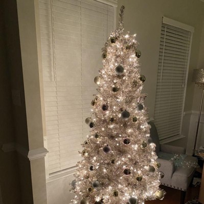 Deck the halls with the Puleo International 6.5-foot Rose Gold Tinsel Artificial Christmas Tree. Inspired by lush wintry forests, this artificial tree has 1003 branch tips and 400 Incandescent Clear Lights. The incorporated lights means no more climbing ladders to string lights, saving decorating time. When a single bulb burns out, the other lights on the strand will stay lit for your convenience. We recommend changing the burnt bulb to prevent future outages. Hypoallergenic and needle-shed resistant, the tree is an great alternative to a yearly real tree purchase. With easy to assemble pieces and an included base, your house will be ready for the holidays faster than you can say "Rockin' Around the Christmas Tree". Measures. 6.5 Foot High x 38 Inch Diameter. lbs