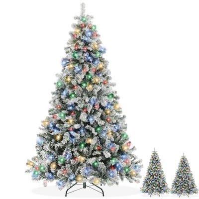 Bring festive brilliance to your home with this 6/7.5ft snow-flocked pre-lit Christmas tree! Featuring 300 multicolor Lights with 8 lighting modes and over 1000 lush branch tips, it creates a vibrant, lifelike holiday centerpiece. Crafted from flame-retardant PVC with a sturdy foldable metal base, it ensures safety, easy assembly, and convenient storage season after season.