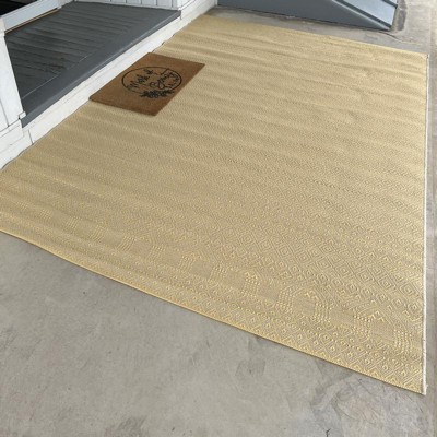 Perfect rug for my deck! The pattern is so pretty. It’s held up great in a few rainstorms already. Laid flat from the start right out of the packaging.