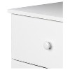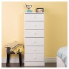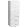Each of the six drawers for clothing measures 13.5" D x 16.5" W x 4.5" H, presenting you with an array of storage options. Its clean white laminate finish and simple design featuring profiled drawer fronts and solid wood knobs present a timeless aesthetic, allowing it to seamlessly blend in with your home decor. This white dresser tall also doubles as a dresser chest, extending its purpose beyond just a clothing storage cabinet.