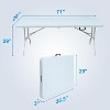 - Foldable and Compact: The 6-foot folding table folds in the middle for easy storage and transport. Compact and safe, it opens and closes in seconds without assembly, fitting conveniently in your car trunk for picnics and outings