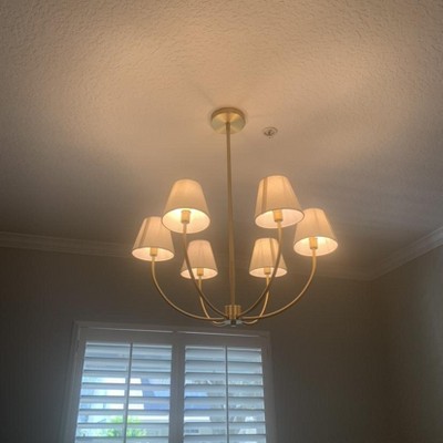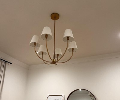 Spruce up your living area or dining room in chic style with this 6-Light Ceiling Chandelier from Threshold™ designed with Studio McGee. Boasting an open design, this metal chandelier features a 6-arm design that extends from a sleek metal body fitted with white shades to illuminate your modern living space. Plus, the simple design in a solid finish blends effortlessly with any decor style and color palettes. Install it above the dining room table to cast a welcoming glow over family dinners, or use it to anchor the design scheme in your living room.