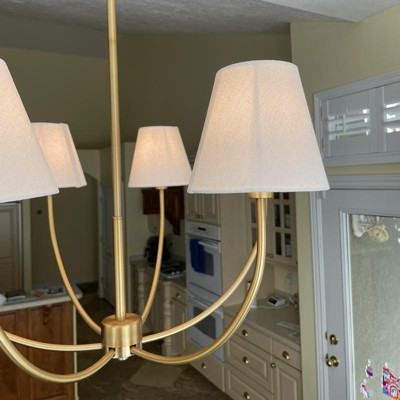 Put it in our kitchen for a change up from our old style chandelier. One of the arms is bent so I have to work on getting that straigtened out. The first time I ordered it, the bottom screw piece didn't sit all the way on, making the threading visible. Love the styling. Mix of traditional and modern. The shades are a nice off-white linen look. Not as white at the picture for sure.