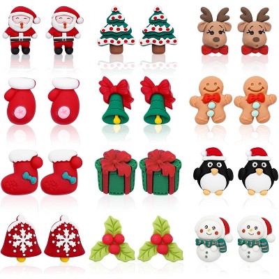 6 Pair Polymer Clay Christmas Stud Earrings Set with Holiday Designs.
