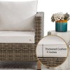 Elevate outdoor living with this elegant resin wicker conversation group featuring a 3-seat sofa, 2 lounge chairs, 2 ottomans, and coffee table. Crafted with weather-proof steel frames and?handwoven UV-resistant wicker, it offers exceptional durability and sophisticated style. Includes 14 plush cushions with zippered covers for easy cleaning and premium lumbar support perfect for creating a resort-like oasis in your backyard or patio.