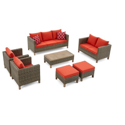 Elevate outdoor living with this elegant resin wicker conversation group featuring a 3-seat sofa, 2 lounge chairs, 2 ottomans, and coffee table. Crafted with weather-proof steel frames and?handwoven UV-resistant wicker, it offers exceptional durability and sophisticated style. Includes 14 plush cushions with zippered covers for easy cleaning and premium lumbar support perfect for creating a resort-like oasis in your backyard or patio.