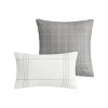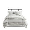 Introduce an upscale cottage charm to your bedroom with the Harbor House Morgan 6 Piece Cotton Comforter Set. This 100% cotton jacquard comforter features textured vertical woven stripes with contrasting horizontal charcoal black stripes on the white ground, for a modest farmhouse look. The cotton comforter is also oversized with visible bartacks to easily cover high depth mattresses and overfilled for extra comfort. Coordinating shams pair handsomely with the comforter, while the solid grey bed skirt adds a charming finishing touch to the oversized comforter set. Also included are 1 square and 1 oblong decorative pillow add textural elements to complete the cottage comforter set. Hypoallergenic polyester filling in the comforter and pillows provide exceptional warmth and comfort. Machine washable for easy care, this cotton comforter is OEKO-TEX certified, meaning it does not contain any harmful substances or chemicals to ensure quality comfort and wellness. Steam iron for wrinkle removal.