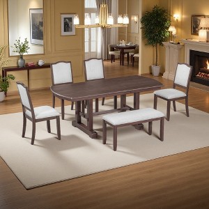 - 6-PIECE VERSATILE DINING SET: Includes 1 classic rectangular dining table, 4 upholstered chairs, and 1 bench. Exudes classic charm, adding beauty and practical seating to any home—ideal for family meals or gatherings.
