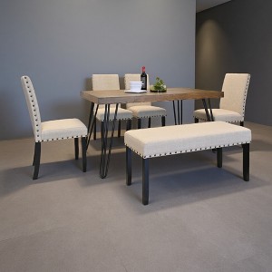 - STYLISH DESIGN HIGHLIGHTS: Rustic dark pine tabletop showcases natural wood grain for warmth, while metallic hairpin legs bring modern industrial charm—blends seamlessly with farmhouse, boho, or contemporary decor. Chairs and bench stand out with soft gray linen-cotton upholstery and brass nailhead trim, adding elegant texture to your dining space.