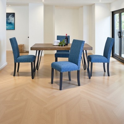 - STYLISH DESIGN HIGHLIGHTS: Rustic dark pine tabletop showcases natural wood grain for warmth, while metallic hairpin legs bring modern industrial charm—blends seamlessly with farmhouse, boho, or contemporary decor. Chairs and bench stand out with soft gray linen-cotton upholstery and brass nailhead trim, adding elegant texture to your dining space.