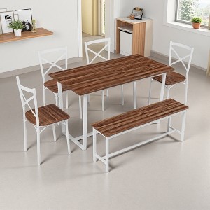 - 6-piece cutlery set: This cutlery set includes a table and four matching chairs, as well as a bench, suitable for family gatherings. The legs of the table and chair are equipped with basic plastic protective foot pads, which can protect the floor from scratches and ensure the stability of the table and chair.