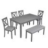 Create a warm and inviting dining space with this 6-piece dining table set, featuring a spacious rectangular table, four upholstered chairs, and a versatile bench. Designed with a durable solid wood frame and a smooth water-resistant tabletop, this set blends modern elegance with everyday functionality. With neutral walnut or gray finishes, it seamlessly complements any décor style while providing comfortable seating for family meals, gatherings, and special occasions.