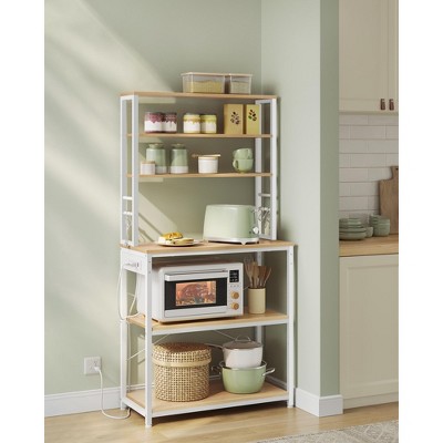 Transform your kitchen with our versatile baker¡¯s rack, offering extensive storage options and adjustable features. Built with a strong steel frame and durable particleboard, this rack accommodates various kitchen essentials securely. Perfect for small spaces, this 6-tier kitchen shelf with added AC outlets is a space-saving solution that ensures stability and safety, making it an ideal addition to any compact kitchen or mini coffee bar setup.