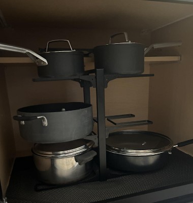 Adjustable - pots and pans organizer allows you to adjust the height to fit almost any size pot/pan with the lid and adjust the number of layers on each side as you like. Kind Reminder-please kindly measure your cabinet to confirm if it fits this cabinet organizer. And please note put small pots on small shelving units, and big pots on large shelving units