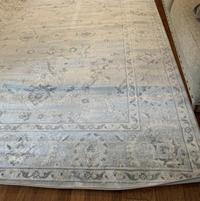 - The rug has shades of gray and silver throughout its timeless design