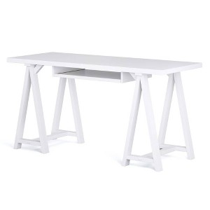 - Features a simple and wide, extra thick table top surface, integrated wood keyboard tray and sturdy sawhorse supports