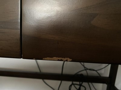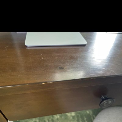 This is a good sized desk and looks really nice. It was very easy to put together and came with extra pieces. However the stain and lacquer finish began chipping almost immediately. I can’t tell if it’s just the finish or if it’s just a soft wood that easily gets indents from writing too hard or keeping my laptop in one spot for too long. Disappointed that my new desk already looks very used. Beyond that, it’s a solid desk, and the hidden electronics compartment is very nice. The drawers are okay, not a great sliding mechanism and they are shallow.