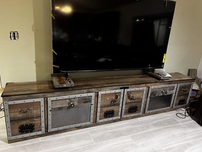 I put two cabinets together to make it the perfect length. Then, I added steampunk embellishments and polyeurethaned the top. The price was cheaper than going through Ashley directly. It is made of particle board, but very sturdy to hold an 85" TV. I am very satisfied with my purchase.