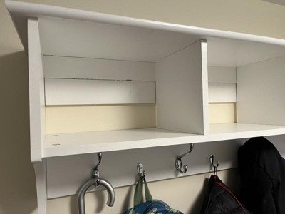 Ideal for an ever expanding household, the 60 in. Wide Hanging Entryway Shelf will keep your entryway belongings together in one place! Suitable for any front hallway, foyer or mudroom, the four compartments provide ample storage for everyone in your family. Fill with baskets, gloves, mittens, hats and books. Five large and four small hooks provide plenty of places to hang jackets, coats, hoodies, sweaters, bags and purses. Installs easily with our innovative hanging rail system.
