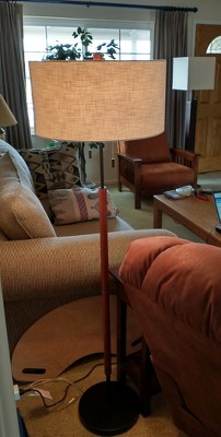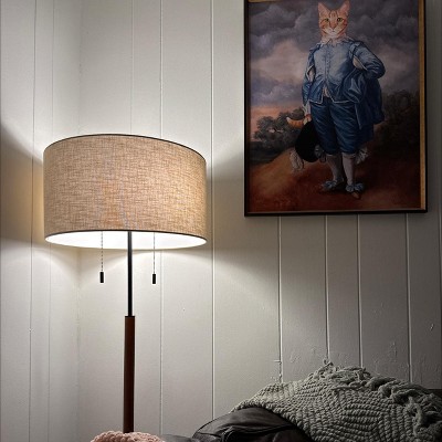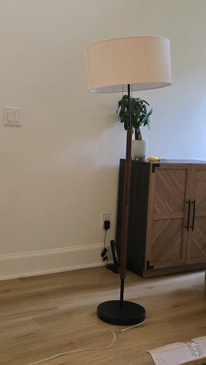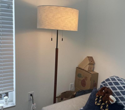 Light up your living space with the sleek and industrial style of this Cut-Off Base Floor Lamp from Project 62™. Made from durable metal and wood in an elegant black finish, this lamp showcases a slim frame standing on a sleek round base with a linen drum shade that will give your room a cozy ambiance and just the right amount of light for reading. The floor lamp comes with a harp and finial for added style, and features a two-socket design with separate pull chains to easily adjust the lighting level to your needs. With a sleek look, this floor lamp blends effortlessly with both classic and contemporary styles.