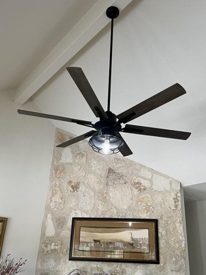 This fan is well worth the money. It is great for a 15 foot ceiling since it has 60 inch blades. We used a 48 inch down rod that they sell separately specifically for this fan. The remote fits onto your light switch. I love that there are no pull strings. The one bulb is easy to replace. The only negative is I wish I would’ve bought it sooner.