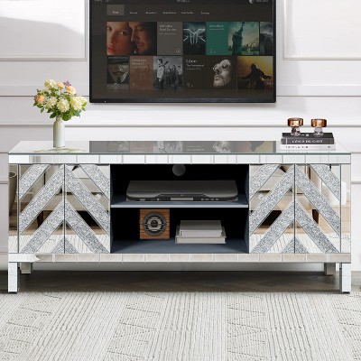 Enhance your living room with this 60" Mirrored TV Stand featuring luxurious crushed diamond glass doors that blend modern elegance with practical storage solutions. Designed to accommodate TVs up to 65 inches, this media console combines style and functionality for a sophisticated home entertainment setup.