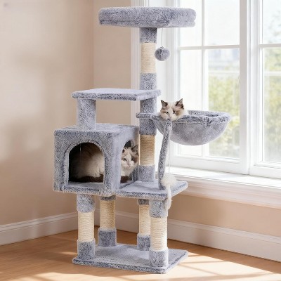 61-Inch Plush Multi-Level Cat Condo with 5 Scratching Posts, 2 Perches, 2 Caves, Hammock