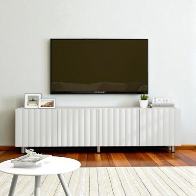 Enhance your entertainment space with this 61-inch multifunctional TV stand. Designed for modern living, it includes a spacious 66-inch console, two tall pier units, and an overhead bridge. The smooth lines, tempered glass accents, and neutral color finish bring elegance and versatility to any living room, bedroom, or office.