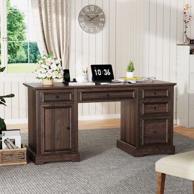 61"W Farmhouse Computer Desk with Drawers, Home Office Desks with Printer Stand, Unique White