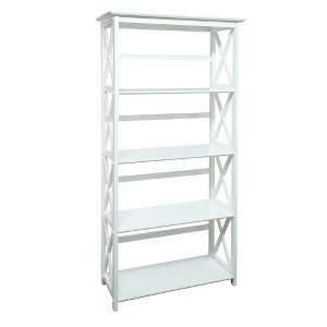 Storage with ease, this Montego X-Design Style Bookcase is constructed with solid wood for lasting use. 5 shelves provide ample storage space. A thorough finish gives this bookcase a strong, contemporary appearance. Perfect for home storage and decor. 4 durable legs provide balanced support for your belongings. Light and easy assembly. Wall mount hardware provided. Product dim: 29.5"W x 11.75"D x 63"H. Weight capacity: 25lbs per shelf.