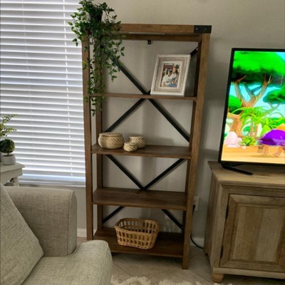 Elevate the look of any room in your home with the Sophie Rustic Farmhouse X-Frame Bookshelf from Saracina Home. Country-inspired metal brackets, X-back accents, and the wood-finish laminate give this bookcase a distinguished farmhouse aesthetic. Four fixed shelves provide sturdy open storage space to display books, family photos, or a growing collection of houseplants. Pair with other pieces in the Sophie collection for a matching set.