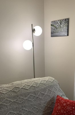 The lamp is beautiful and just as pictured! I wasn’t able to find this in stores so I had it shipped to me and it was packaged super well. The brass finish on the lamp pole and base is beautiful, the base has good weight to it, and the glass globes seem sturdy and look amazing. The glass globes were a little difficult to put onto the prongs and I’m slightly concerned that it’ll be an issue to have to change the bulbs someday since it’s such a snug fit. Overall, I love this lamp and it’s exactly what I was looking for!