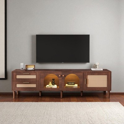 Upgrade your living room or media room with this 67.9-inch mid-century modern rattan TV stand. Combining natural rattan cabinet doors with sturdy solid wood legs, it delivers timeless style and practical storage. With space for TVs up to 75 inches, sliding doors to hide clutter, and open shelves for easy access, it keeps your entertainment area organized. Durable materials and simple assembly make this TV cabinet both stylish and functional for any modern home.