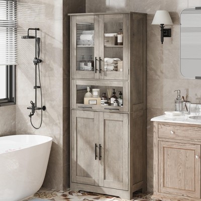 - Modern & Elegant Style The minimalist design suits various décor styles, while the glass doors add a clean, modern touch. Ideal for bathrooms, living rooms, kitchens, dining rooms, or any area needing organized vertical storage.