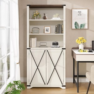 This bookshelf offers ample storage: 3 open shelves for displays and a bottom cabinet with adjustable internal shelves for hidden items. Made of high-quality MDF with waterproof surfaces, it’s durable—0.7" thick layers and a sturdy base support 25 lbs per shelf (35 lbs at bottom). Its unique farmhouse design combines a white finish, iron X barn doors, and wood grain. Versatile (15.3" D x 30.7" W x 67" H) for various rooms, easy to assemble with instructions/video, and includes an anti-tip device.