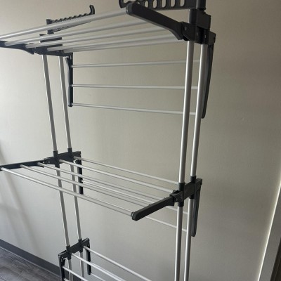 - Large Capacity This 4 tier, 25.2"D x 49.6"W x 68.1"H drying rack features 3 top tiers, 2 rotating wings with 14 slots, and a bottom tier for shoes. It's your all in one solution for drying everything from socks and towels to family outfits and blankets
