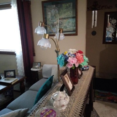 Enhance your bedroom or living room with the Presley 3-Arm Floor Lamp. A simple, yet functional style updated with a shiny gold finish and a unique shade construction. A clear plastic outer shade covers a frosted inner shade creating a beautiful glow when lit. Three adjustable gooseneck arms conveniently bring the light to wherever it is needed. This floor lamp can function as both an ambient light source for a large living space or directive task lighting for a workspace. . A rotary switch on the pole adjusts the light to 3 different settings: 1 light on, 2 lights on, all lights on, and off. This lamp is smart outlet compatible and has a clear cord. Bulbs are not included.