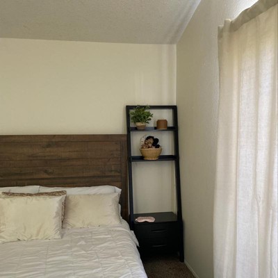 The Bellamy Leaning Shelf with Drawers brings a contemporary, polished look to your storage and display. Ideal for apartment living or smaller rooms, this space-saving unit features two drawers for storage and two open shelves for books, photos, or other decor. Made of Solid and Composite Wood for durability, the unit is finished in a sleek Black and can be combined with the other modular Bellamy Leaning Shelves to create even more storage and display options. The side and back railings on the shelves keep your items in place. Comes with tip resistant hardware to keep the unit securely attached to the wall.