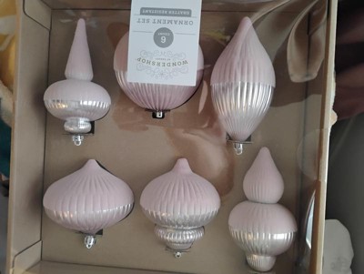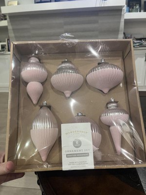 I like the different shapes in this set. It is a bigger size ornament. The subtle pink color is great. It will look so pretty on a flocked tree. It is a tiny bit earth friendly, some of it is made of recycled plastic - wish it was a higher percentage. It’s nice that it’s not made of glass.