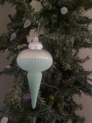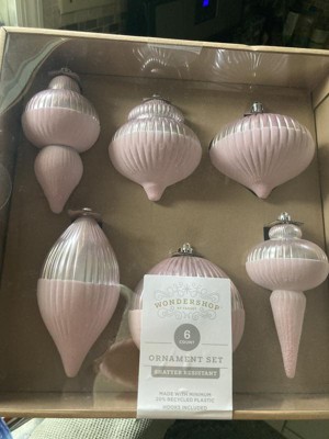 I like the different shapes in this set. It is a bigger size ornament. The subtle pink color is great. It will look so pretty on a flocked tree. It is a tiny bit earth friendly, some of it is made of recycled plastic - wish it was a higher percentage. It’s nice that it’s not made of glass.