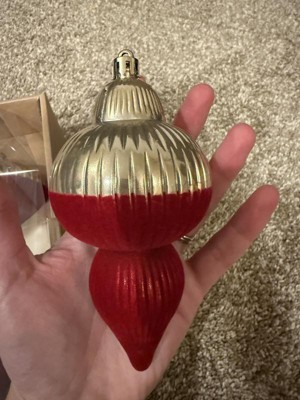 I really like how these ornaments look. The top half is a shiny gold, and the bottom half is flocked/fuzzy and looks like it was dipped in red. They definitely fit a Christmas theme. The ornaments come in 6 different sizes and are fairly big, ranging from around 3.5 to 5 inches.