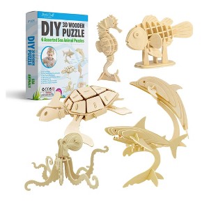 DIY 6-piece 3D wooden sea animal bundle pack includes Shark, Dolphin, Sea Turtle, Seahorse, Octopus and Clown Fish.